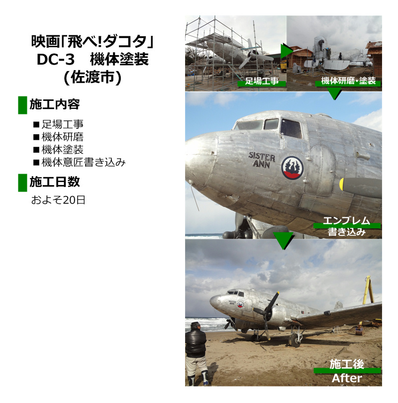 佐渡市素浜でロケーションが行われた映画「飛べ!ダコタ」で撮影に使用されたDC-3機体の研磨・塗装を施工致しました