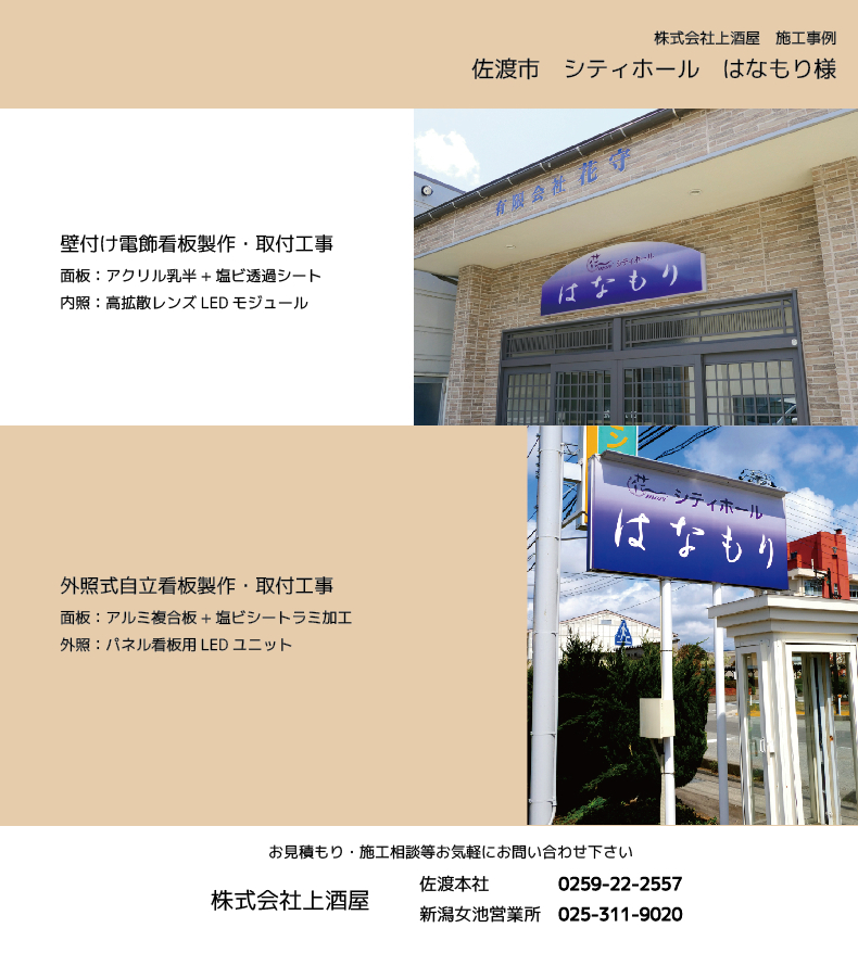 佐渡市のシティホールはなもり様のLED看板製作・設置工事を施工致しました
