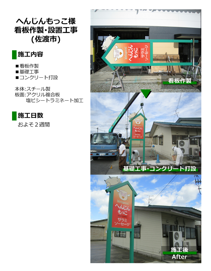 佐渡市大野のへんじんもっこ様の看板製作・設置工事を施工致しました