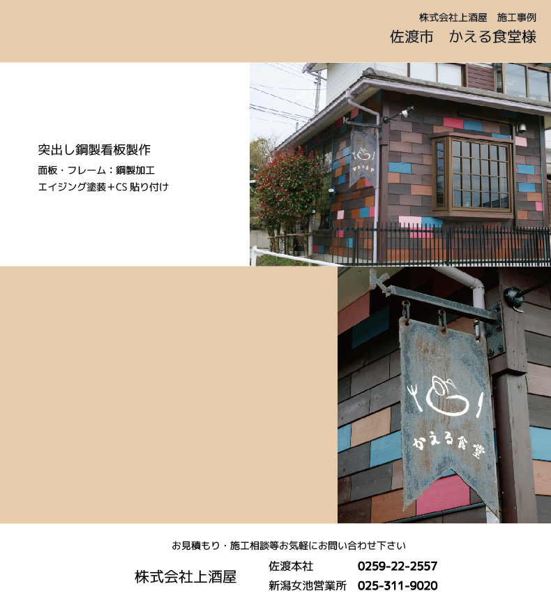 佐渡市のかえる食堂様の鋼製看板製作工事を施工致しました
