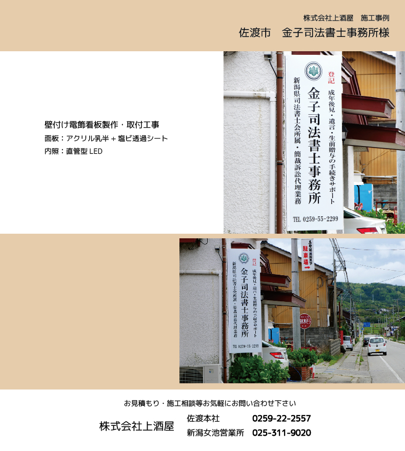 金子司法書士事務所様 LED看板製作・設置工事(佐渡市)