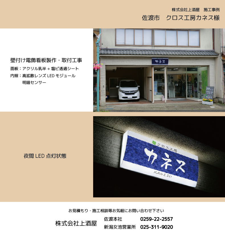 佐渡市のクロス工房カネス様のLED看板製作・設置工事を施工致しました