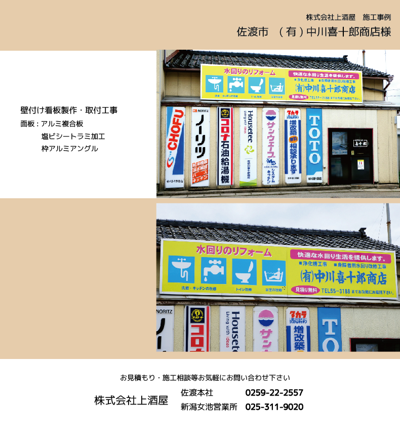 佐渡市の有限会社中川喜十郎商店様の看板製作・設置工事を施工致しました
