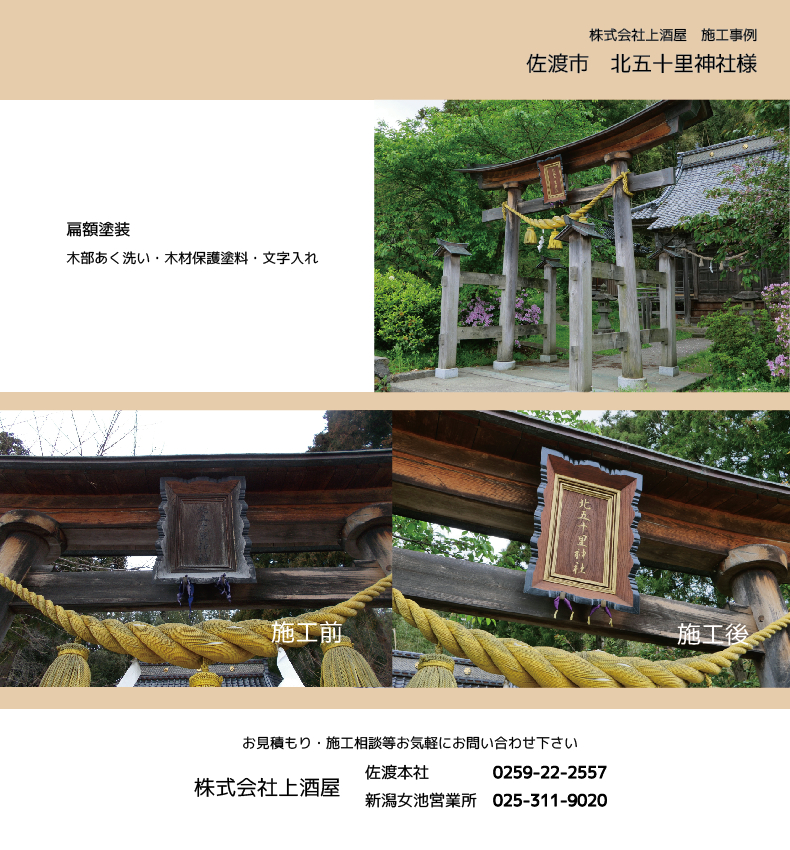 佐渡市の北五十里神社様の扁額塗装工事を施工致しました