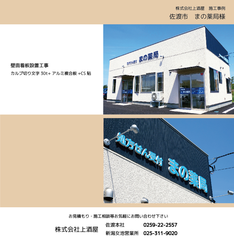 佐渡市のまの薬局様の壁面看板製作・設置工事を施工致しました