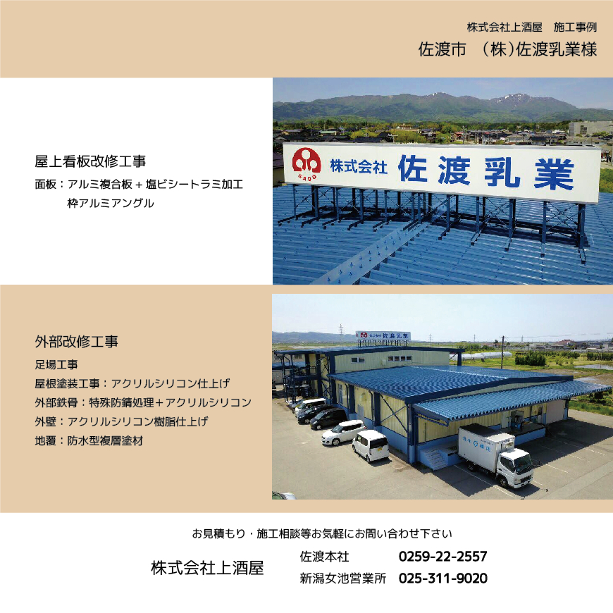 (株)佐渡乳業様 屋上看板製作・外部改修工事(佐渡市)